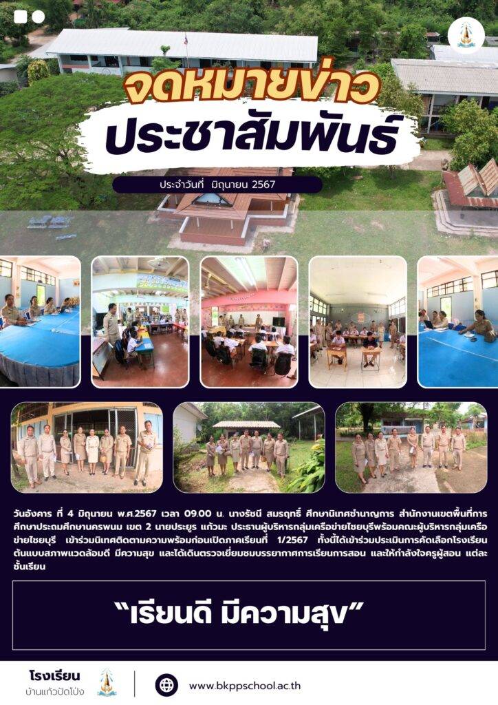 วันอังคาร ที่ 4 มิถุนายน พ.ศ.2567 เวลา 09.00 น. นางรัชนี สมรฤทธิ์ ศึกษานิเทศชำนาญการ สำนักงานเขตพื้นที่การศึกษาประถมศึกษานครพนม เขต 2 นายประยูร แก้วมะ ประธานผู้บริหารกลุ่มเครือข่ายไชยบุรีพร้อมคณะผู้บริหารกลุ่มเครือข่ายไชยบุรี เข้าร่วมนิเทศติดตามความพร้อมก่อนเปิดภาคเรียนที่ 1/2567 ทั้งนี้ได้เข้าร่วมประเมินการคัดเลือกโรงเรียนต้นแบบสภาพแวดล้อมดี มีความสุข และได้เดินตรวจเยี่ยมชมบรรยากาศการเรียนการสอน และให้กำลังใจครูผู้สอน แต่ละชั้นเรียน