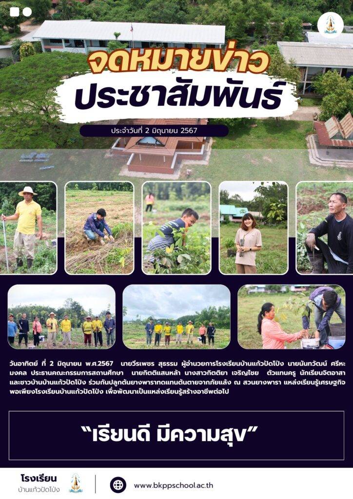 วันอาทิตย์ ที่ 2 มิถุนายน พ.ศ.2567 นายวีรเพชร สุธรรม ผู้อำนวยการโรงเรียนบ้านแก้วปัดโป่ง นายนันทวัฒน์ ศรีหะมงคล ประธานคณะกรรมการสถานศึกษา นายกิตติแสนหล้า นางสาวกิตติยา เจริญไชย ตัวแทนครู นักเรียนจิตอาสา และชาวบ้านบ้านแก้วปัดโป่ง ร่วมกันปลูกต้นยางพาราทดแทนต้นตายจากภัยแล้ง ณ สวนยางพารา แหล่งเรียนรู้เศรษฐกิจพอเพียงโรงเรียนบ้านแก้วปัดโป่ง เพื่อพัฒนาเป็นแหล่งเรียนรู้สร้างอาชีพต่อไป