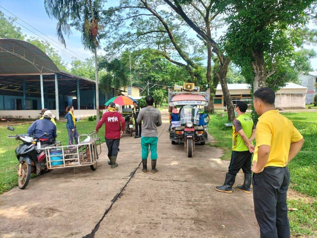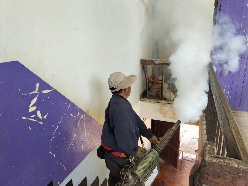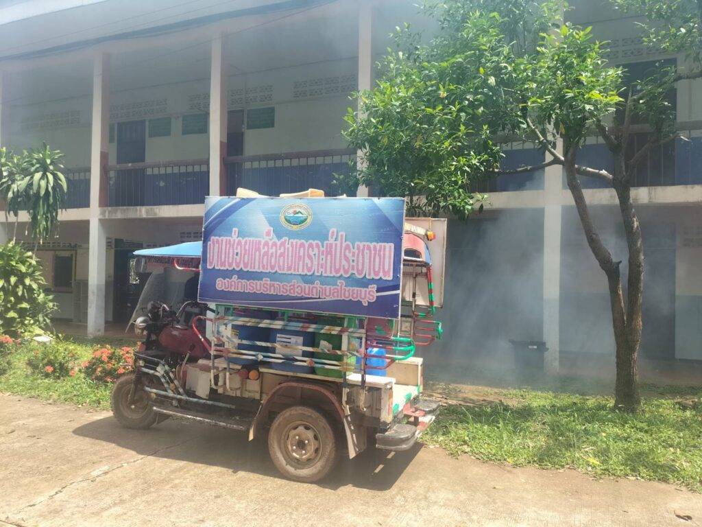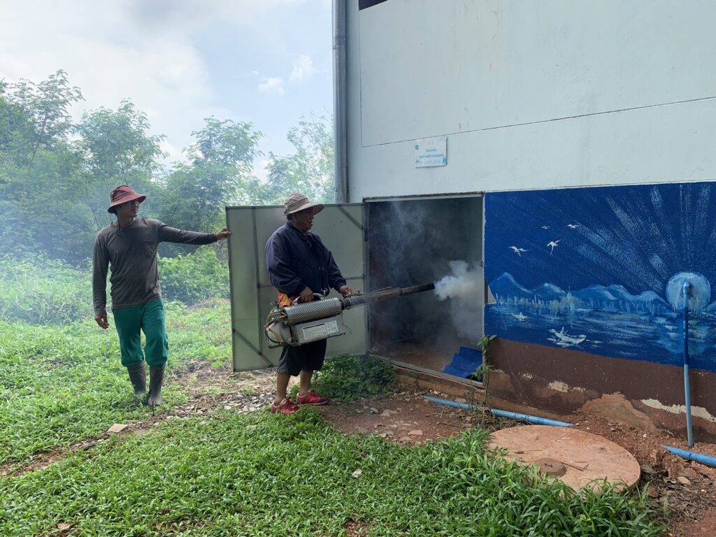 ฉีดพ่นหมอกควันไล่ยุง และใส่ทรายอะเบทกำจัดลูกน้ำยุงลาย