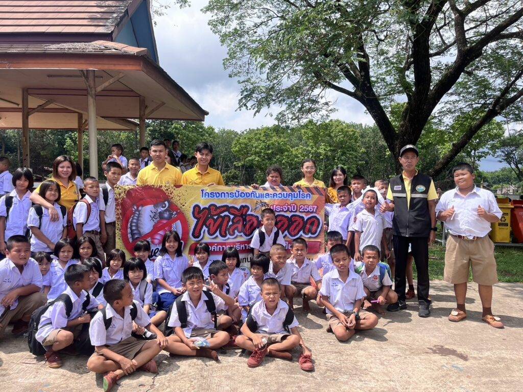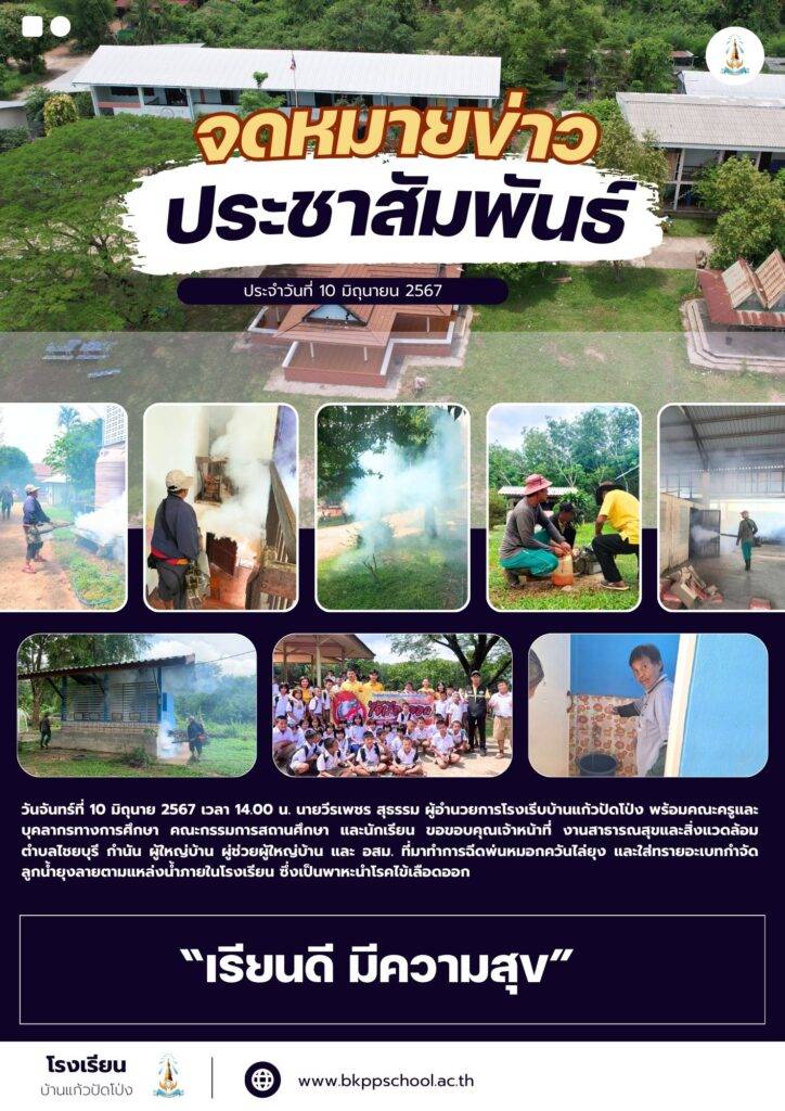 วันจันทร์ที่ 10 มิถุนาย 2567 เวลา 14.00 น. นายวีรเพชร สุธรรม ผู้อำนวยการโรงเรีบบ้านแก้วปัดโป่ง พร้อมคณะครูและบุคลากรทางการศึกษา คณะกรรมการสถานศึกษา และนักเรียน ขอขอบคุณเจ้าหน้าที่ งานสาธารณสุขและสิ่งแวดล้อมตำบลไชยบุรี กำนัน ผู้ใหญ่บ้าน ผู่ช่วยผู้ใหญ่บ้าน และ อสม. ที่มาทำการฉีดพ่นหมอกควันไล่ยุง และใส่ทรายอะเบทกำจัดลูกน้ำยุงลายตามแหล่งน้ำภายในโรงเรียน ซึ่งเป็นพาหะนำโรคไข้เลือดออก