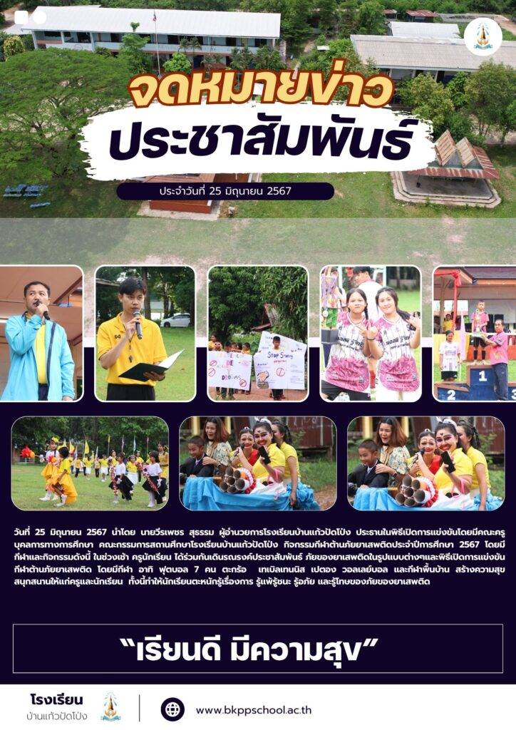 วันที่ 25 มิถุนายน 2567 นำโดย นายวีรเพชร สุธรรม ผู้อำนวยการโรงเรียนบ้านแก้วปัดโป่ง ประธานในพิธีเปิดการแข่งขันโดยมีคณะครู บุคลการทางการศึกษา คณะกรรมการสถานศึกษาโรงเรียนบ้านแก้วปัดโป่ง กิจกรรมกีฬาต้านภัยยาเสพติดประจำปีการศึกษา 2567 โดยมีกีฬาและกิจกรรมดังนี้ ในช่วงเช้า ครูนักเรียน ได้ร่วมกันเดินรณรงค์ประชาสัมพันธ์ ภัยของยาเสพติดในรูปแบบต่างๆและพิธีเปิดการแข่งขันกีฬาต้านภัยยาเสพติด โดยมีกีฬา อาทิ ฟุตบอล 7 คน ตะกร้อ เทเบิลเทนนิส เปตอง วอลเลย์บอล และกีฬาพื้นบ้าน สร้างความสุข สนุกสนานให้แก่ครูและนักเรียน ทั้งนี้ทำให้นักเรียนตะหนักรู้เรื่องการ รู้แพ้รู้ชนะ รู้อภัย และรู้โทษของภัยของยาเสพติด
